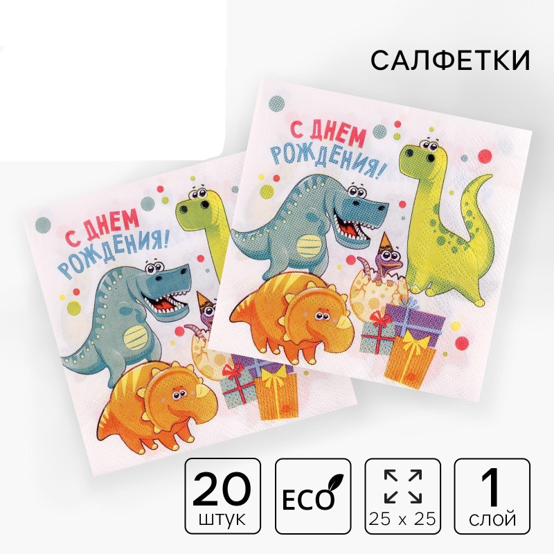 4669375 Набор белых салфеток "С Днем рождения! Динозавры" (20 шт.) Размер 25 х 25 см.