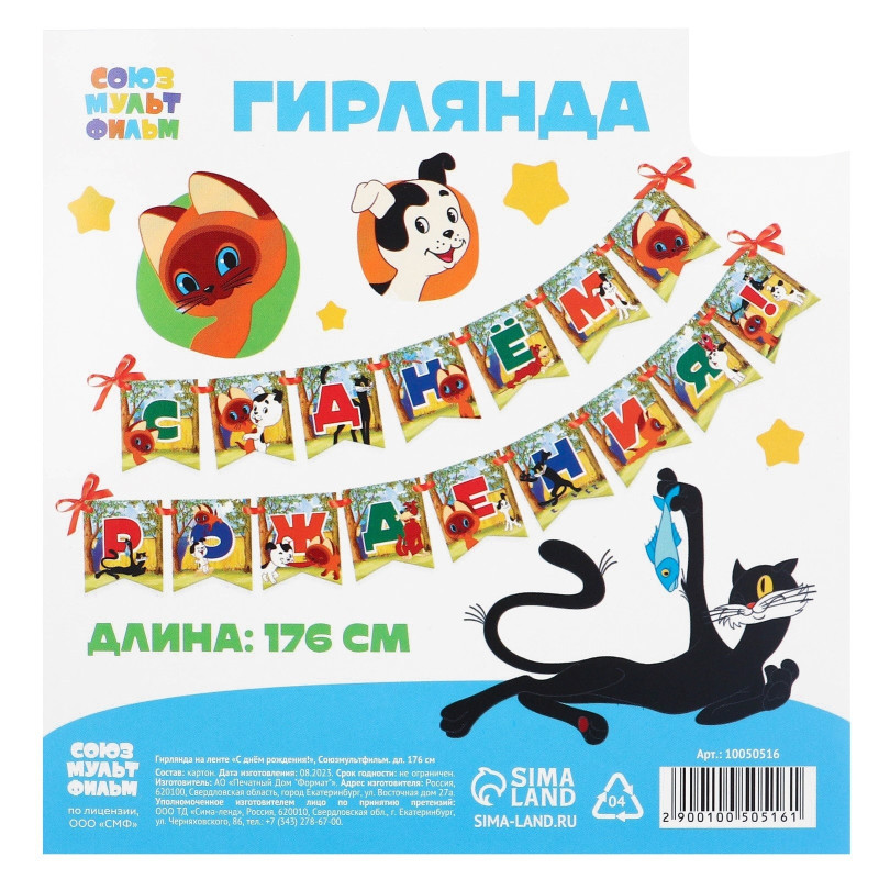 10050516 Гирлянда на ленте "С Днем рождения! Котенок Гав " Длина 176 см.