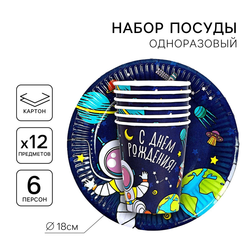 Главная / Каталог / Космос / 7105119 Набор темно синий "С Днем рождения! Космос": стаканы (6 шт.) + тарелки (6 шт.)