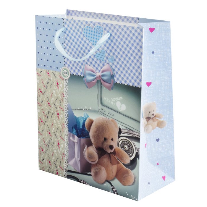 БР 1404-1М Пакет подарочный "Плюшевый мишка на голубом фоне" Размер 18 * 23 см.