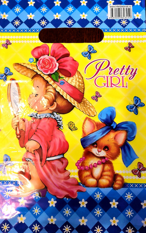 КП 43450 Пакет "Девочка модница с котенком" с вырубной ручкой.Размер 20*30 см.