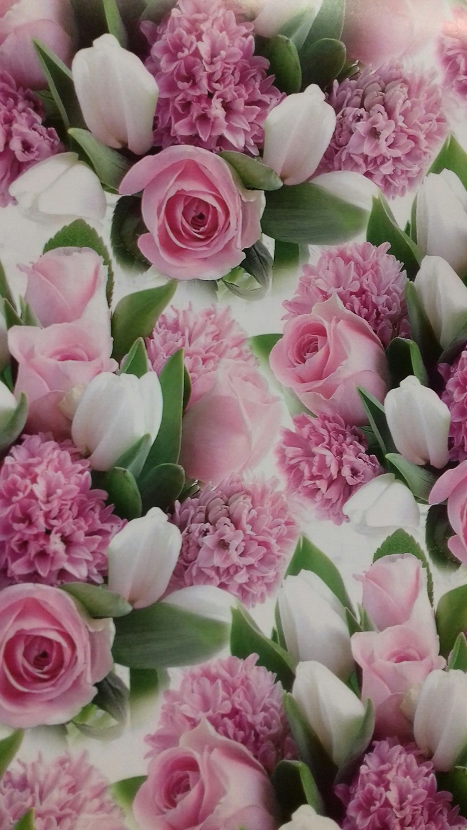 КП 1261 Бумага упаковочная "Розовые розы и белые тюльпаны" Размер 70*100 см.