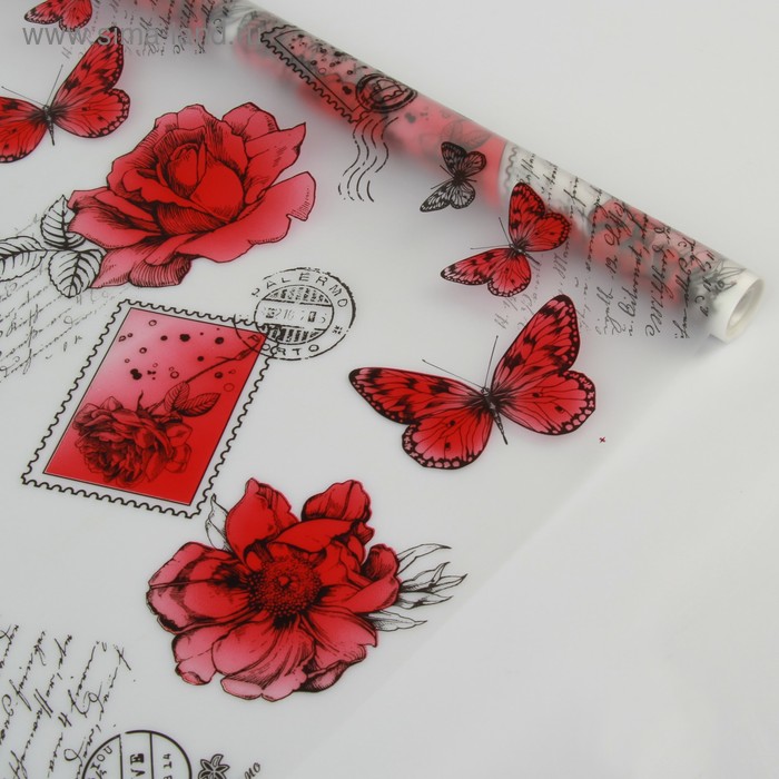 2890716 Упаковочная пленка "Красные бабочки и розы" Ширина 70 см. Плотность 32 мкм