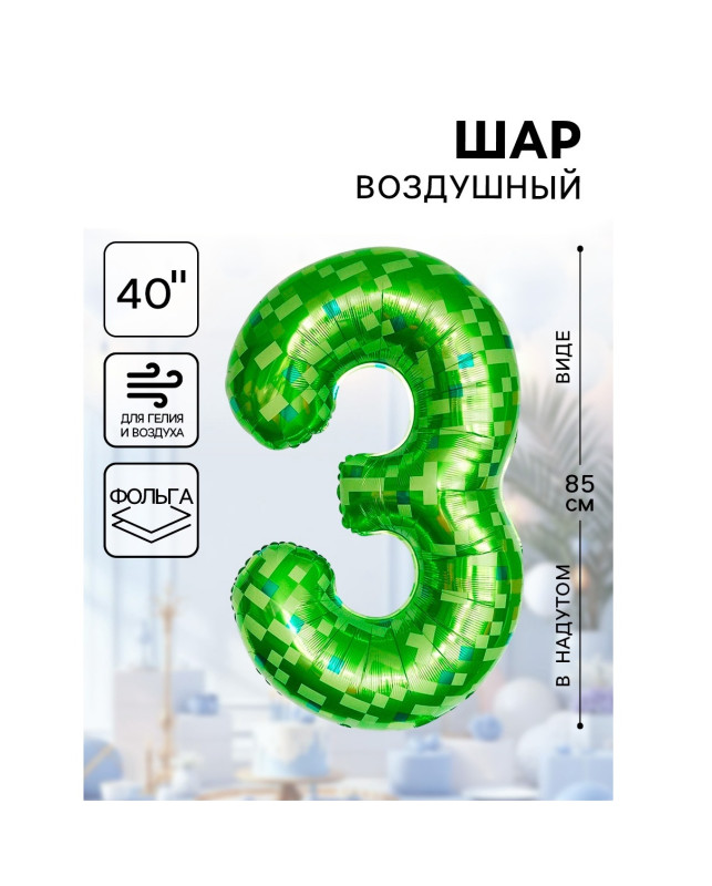 10919686 (ДБ 26903) Зеленая в клетку фольгированная "Цифра 3" Высота 85 см.