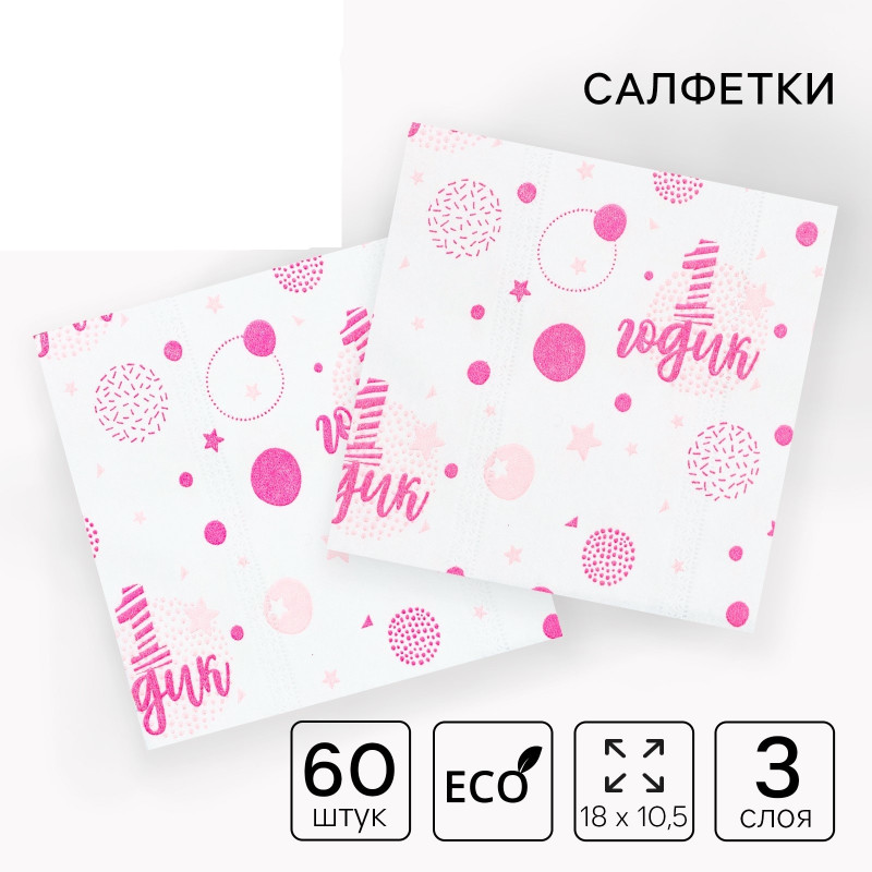 9847497 Набор салфеток "1 годик" для девочки (60 шт.) Размер 18 х 10,5 см.