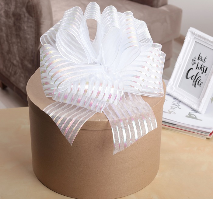 133102 Белый бант в полоску из органзы для упаковки. Ширина 10 см.
